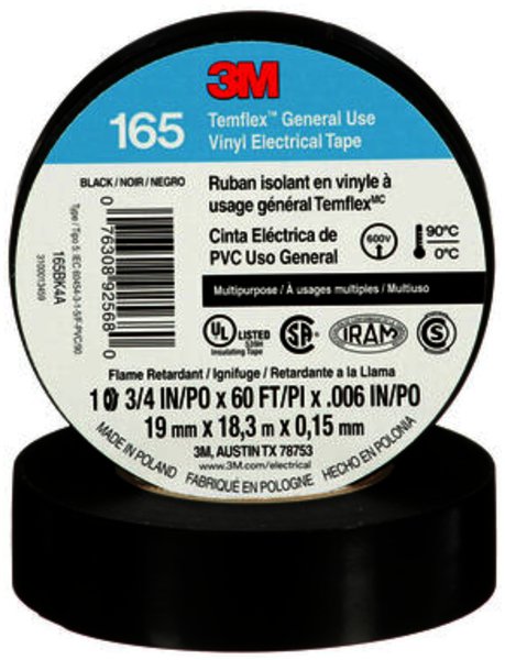 3M Highland Vinyl Electrical Tape is a black 7 mil tape that is 3M Temflex Vinyl Electrical Tape 165 is a good quality, multi-purpose vinyl insulating tape. It has great resistance to moisture and varying weather conditions. It is a polyvinyl chloride (PVC) tape that is flame retardant and conformable. 3M Temflex 165 Tape provides great mechanical protection with minimum bulk. It is a UL Listed and CSA Certified Insulating Tape. Flexible stretchy conformable commercial grade vinyl that is flame retardant. 3M Highland Tape can be used for protective jacketing and harnessing.Specifications
