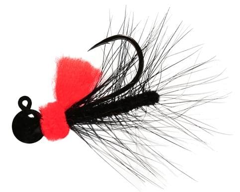 BLACK; Hand Tied & Inspected; Patented Tail Section; POWDER PAINTED HEADS WITH A SCENT FREE FINISH; PREMIUM FEATHERS; Unpainted Eyes on Every Jig; UV & FLUORESCENT DYES & PIGMENTS