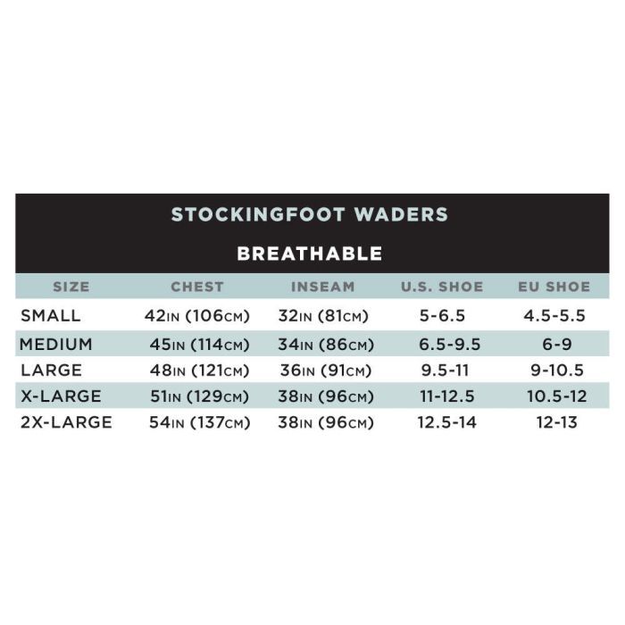 The Platte Pro Breathable Stockingfoot Fishing Waders feature DuPont Teflon DWR fabric protector and an ultra-fresh antimicrobial treatment as well as an interior flip out storage pocket. With advanced MPT Micro Pore Technology, these Waders have 2-tone articulated knees, padded air mesh shoulder straps, built-in gravel guards, high-density Neoprene double taped booties, multiple D-rings on the front and the back. Stretch waist belt.Specifications