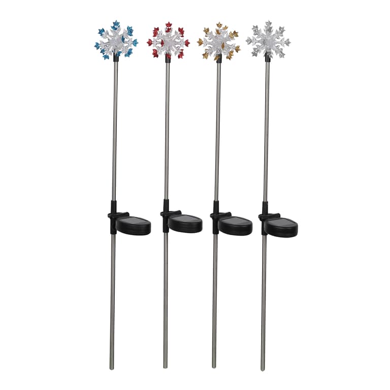 About 18" tall, easy stake installation; Bright multi-color LEDs on snowflake tips create festive glow; Durable plastic and metal resist winter weather; Solar-powered with built-in panelno batteries or cords needed; Tray of 20, perfect for gardens, pathways, or holiday displays.