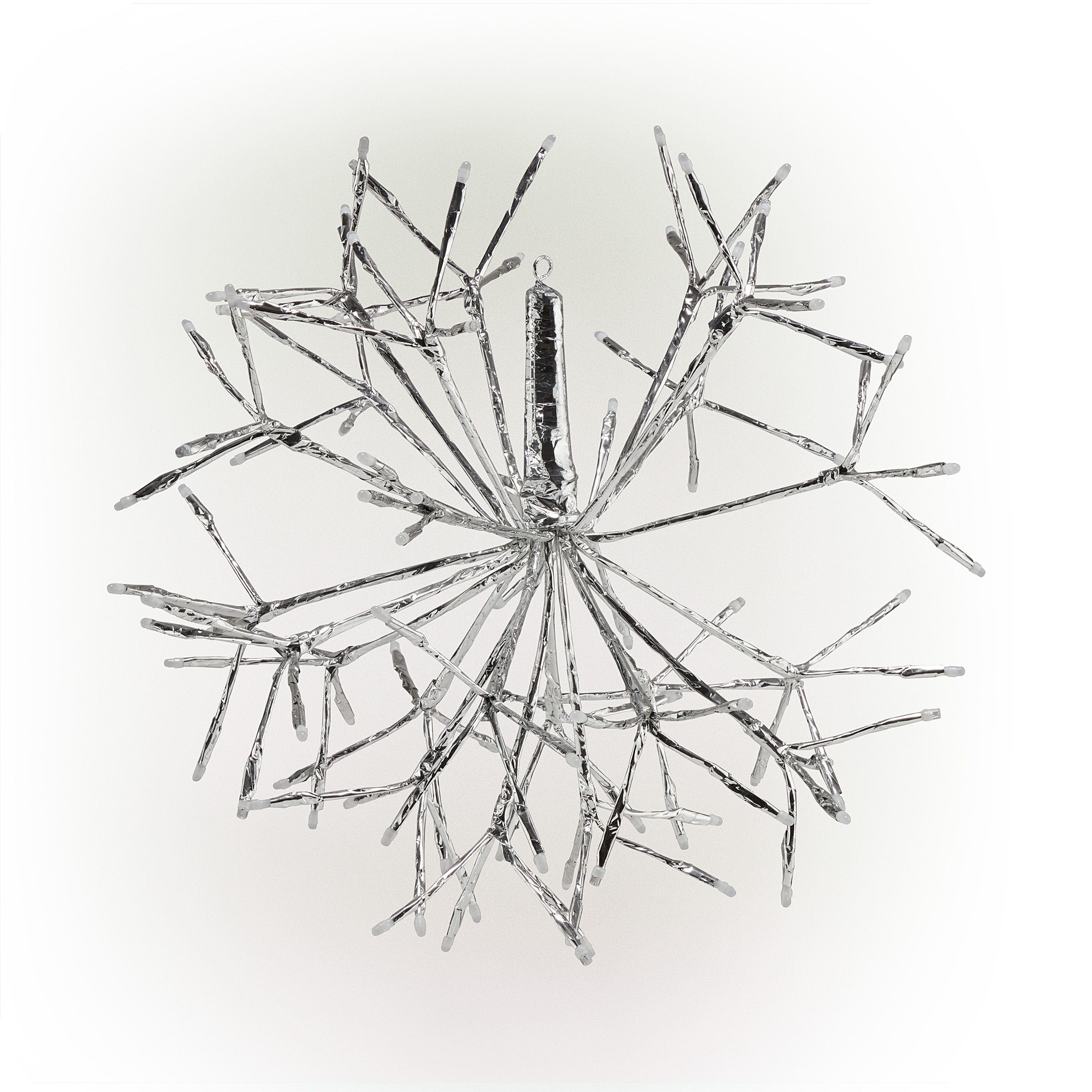 Upgrade your holiday decor with the Alpine Corporation's 16"H Holiday 3D Snowflake Hanging Ornament with LED Lights! This ornament has a snowflake branch design and is wrapped with silver tape for a unique and stylish appearance. It features 84 multi-colored LED lights and 12 twinkling lights to provide a stunning nighttime display.The flexible construction allows you to bend and twist the decor to your desired shape. The hanging ornament includes a UL listed transformer and a 10 ft. cord for safe, easy use throughout your home, and the collapsible design provides easy storage. Hang on your Christmas tree, by your stockings, or simply over a door for a touch of Christmas spirit! At over 1 ft. wide, the Alpine Corporation Hanging Snowflake Ornament measures 16"L x 16"W x 16"H and is the perfect addition to your holiday decor.Alpine Corporation is one of America's leading designers, importers, and distributors of superior quality home and garden decor products. Alpine Corporation's award winning in-house design team continuously develops new and innovative "statement pieces" for your home and garden. Your indoor and outdoor living spaces will be the envy of the neighborhood with our wide assortment of fresh, fashionable and contemporary products, from beautifully crafted solar garden stakes featuring patented motion and fiber optic lighting technology to beautiful fountains and delightful bird baths and feeders.Specifications