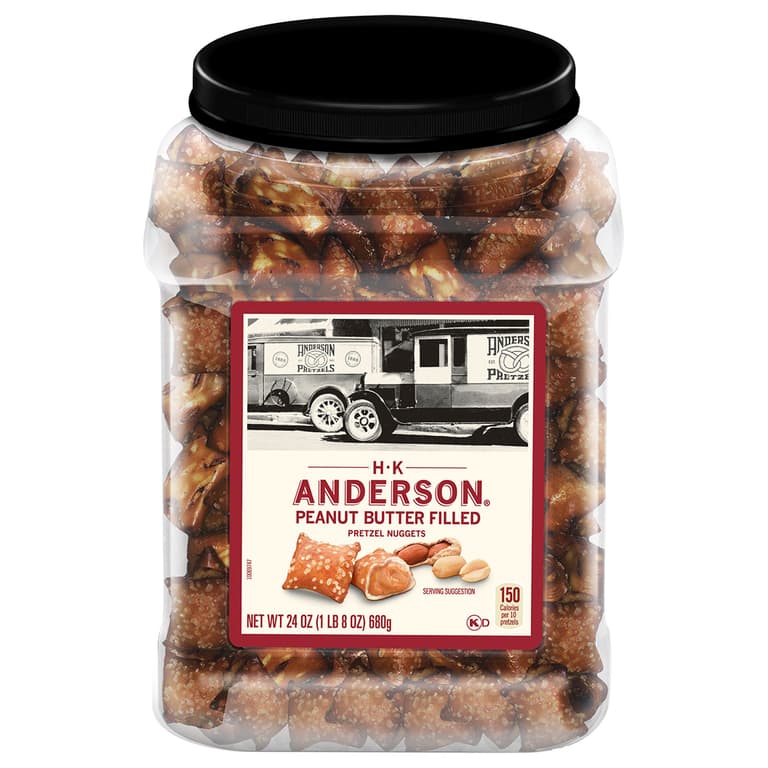 Entertain your guests with a movie, some trivia games, and of course, great snacks. When there is a break in the action, H.K. Anderson peanut butter pretzels will satisfy everyone's cravings with a perfect combination of salty and sweet. Crunchy H.K. Anderson pretzels filled with smooth peanut butter make a delicious snack.Specifications