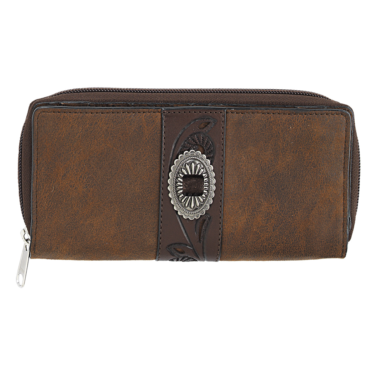 Angel Ranch wallet by M&F Western Products from the Hazel collection. It features a man made material body with a leather center overlay and a slotted concho. One back zippered pocket on outside. Inside there are multi cash and card slots along with an ID window. One large zipper change compartment with a center zipper compartment.Specifications