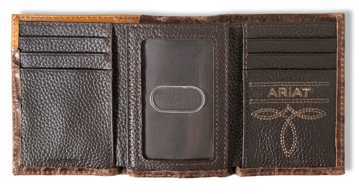 Ariat trifold wallet by M&F Western Products. This great wallet is made of genuine leather with a croco texture and heavy duty stitching. Accented with a tan tab with floral embossing. Slim fit design. Credit card slots and one clear ID pocket for plenty of storage.Specifications