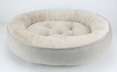 Accent piping along edge; Durable fabrics, machine washable; Non skid bottom; Oval shape, ideal for dogs who curl up as well as lay flat; Polyester fiber filled; Suitable for pets up to 90 lbs; Textured, woven two tone wall and short file fur cushion; Tufted cushion to keep filling securely in place