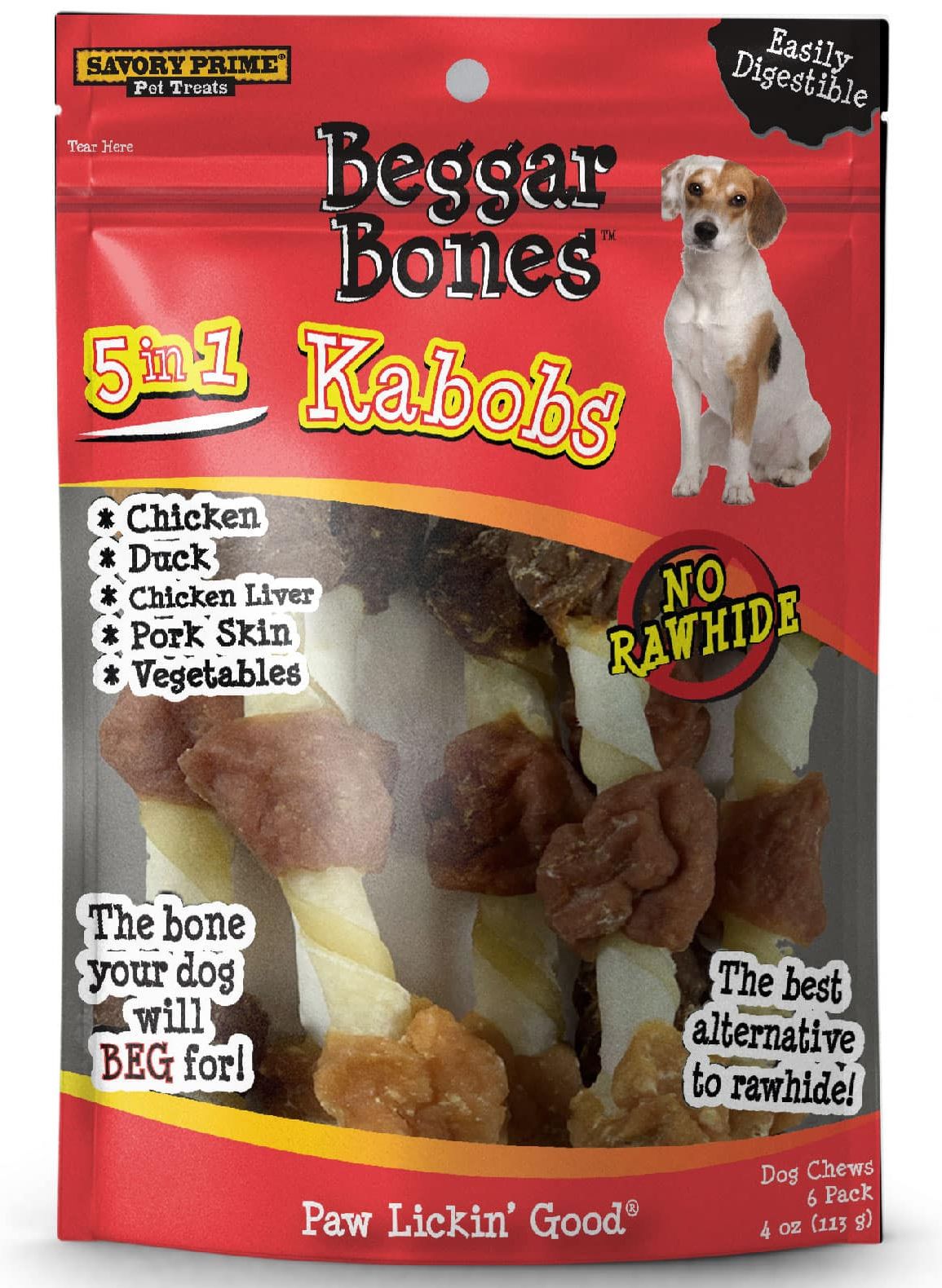 Beggar Bones are a great alternative to rawhide bones. Beggar Bones are over 99% digestible and completely safe for all dogs. We use farm raised chicken and pork skin in our bones so your dog will love the great taste! Beggar Bones satisfies your dog’s chewing needs and helps keep their teeth and gums healthy too. Our independent studies show dogs prefer Beggar Bones 10 to 1 over competitor bones.Specifications