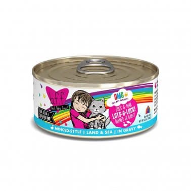 Turn meal time into yum time for your best feline friend with the BFF OMG Lots-O-Luck! Duck & Tuna Dinner in Gravy Grain-Free Canned Cat Food. Made with duck broth, duck and tuna as the top ingredients, plus essential vitamins and minerals, it provides a gravylicious and balanced diet for adult kitties. Since it’s packed with broth, it’s a great way to add much-needed hydration to keep your pal healthy. Plus, it’s made with sustainably sourced ingredients in state of the art food facilities with nothing artificial.Specifications