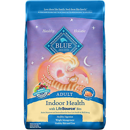 BLUE Buffalo Indoor Health Adult Chicken and Rice Dry Cat Food. Our natural BLUE Indoor Health cat food is holistically formulated to support the needs of indoor cats. It starts with the carefully balanced calories in our ingredients to help them maintain a healthy body weight. Cats love our tasty chicken, and it provides them with essential amino acids they need every day. Hearty whole grains like brown rice, barley and oats supply the complex carbohydrates that your cat needs for energy. Whole carrots, sweet potatoes and parsley are three of the nutrient-rich vegetables that your cat will get in every bite of BLUE. LifeSource(R) Bits contain a precise blend of vitamins, minerals and antioxidants selected by holistic veterinarians and animal nutritionists. Importantly, BLUE LifeSource Bits are "cold-formed" separately from the rest of our kibble to help preserve the potency of the ingredients. BLUE Indoor Health cat food is made in the USA. Features: Made in the USA. Strengthens immune system. A great natural protein source. Offers essential amino acids and other nutrients. Ideal for indoor cats. High Quality Protein, Wholesome Whole Grains, and Healthy Garden VeggiesSpecifications