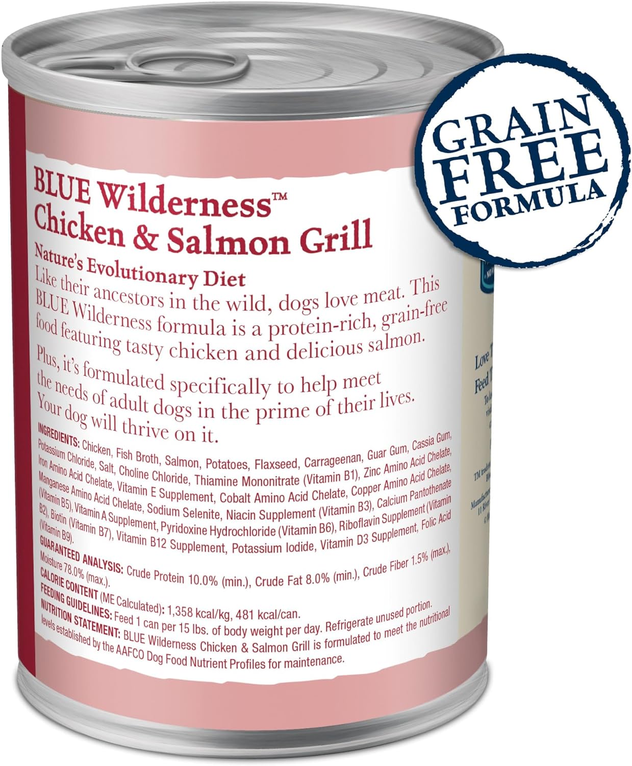 Feed your dog's wild side with BLUE Wilderness Natural Wet Dog Food, Salmon & Chicken Grill. Made with a protein-rich blend of high-quality turkey and chicken, this grain-free dog food provides the energy your dog needs to stay active. Your dog will love the flavors and texture of this high-protein recipe. And like all Blue Buffalo natural dog food recipes, BLUE Wilderness dog food does not contain any chicken (or poultry) by-product meals. It is also free of corn, wheat, soy, artificial flavors, and preservatives. You can feel great knowing Blue Buffalo is helping your dog thrive with a protein-packed diet.Specifications