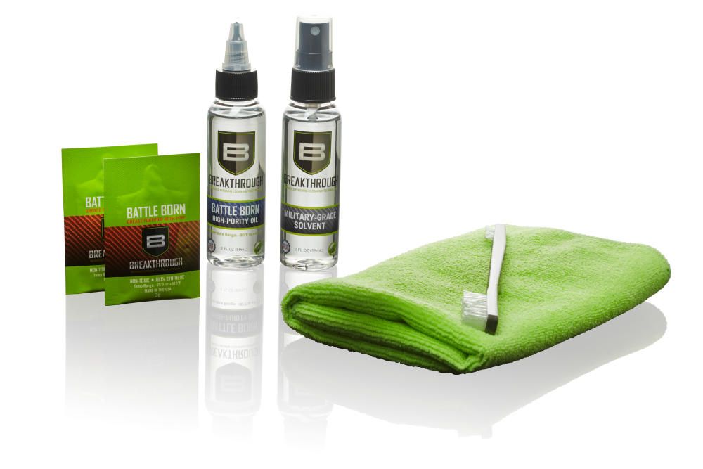 Get everything you need for a simple and superior clean with our Breakthrough Clean Basic Gun Cleaning Kit. Kit contains all the necessities for a quick and superior clean. Our Basic Kit contains three of our top rated cleaners and lubricants: Breakthrough Military Grade Solvent, Battle Born High Purity Oil, and Battle Born Grease fortified with PTFE. Your cleaning kit also includes a double ended nylon brush and a micro-fiber towel. Our bestselling cleaning kit is a must-have for any gun owners’ cleaning and lubricating arsenal.Specifications