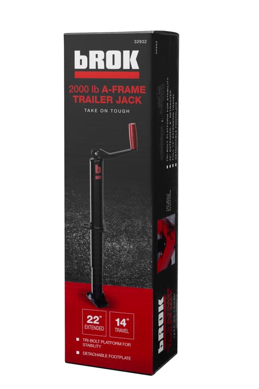 2000lb capacity; 22Inch Lift; A Frame Styler; Its tri-lobed mounting plate can be welded or bolted in position on your trailer and the jack is designed to routinely lift 2,000-lbs of weight. This bROK jack includes a smooth rotating top wind hand; top Wind
