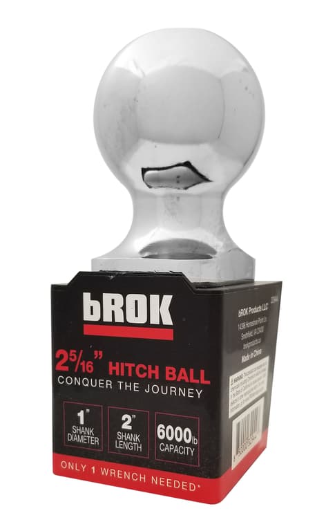 2 5/16" chrome tow hitch ball with a 1" diameter and 2 " long shank. The towing capacity is 6,000 lb and when using Brok ball mounts only 1 wrench is needed to tightenbROK hitch balls are the next evolution in hitch ball design. Created for long life from solid forged steel, these hitch balls provide a convenient one wrench tightening method when used with bROK pinSpecifications