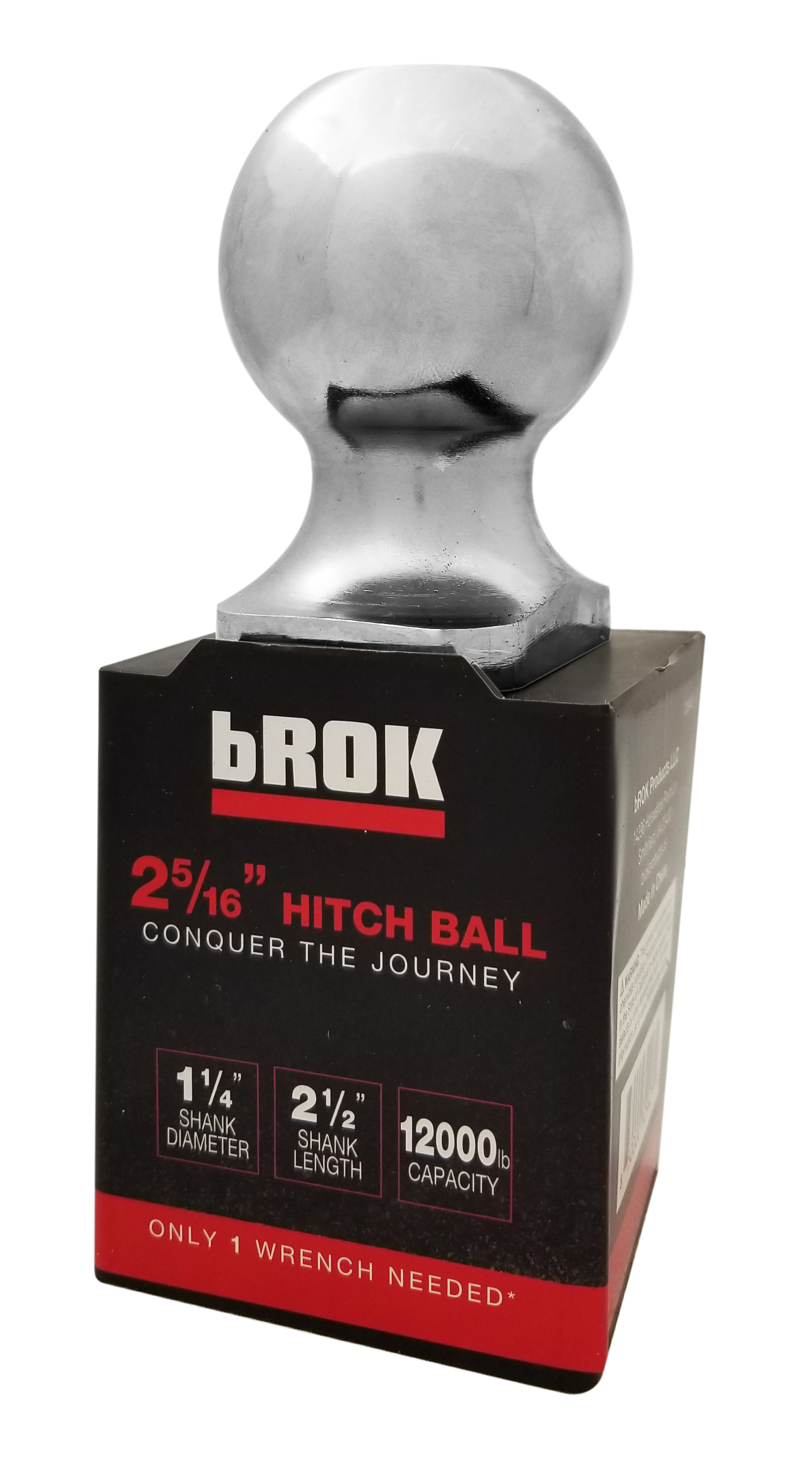 2 5/16" chrome tow hitch ball with a 1 1/4" diameter and 2 3/4 " long shank. The towing capacity is 12,000 lb and when using Brok ball mounts only 1 wrench is needed to tighten; bROK hitch balls are the next evolution in hitch ball design. Created for long life from solid forged steel, these hitch balls provide a convenient one wrench tightening method when used with bROK pin