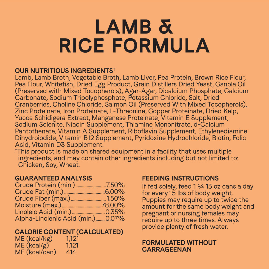 Canidae All Life Stages Formula with Lamb and Rice Wet Dog Food is an all natural, high-quality, and holistic pet food that features high-quality lamb as the main protein source.Specifications