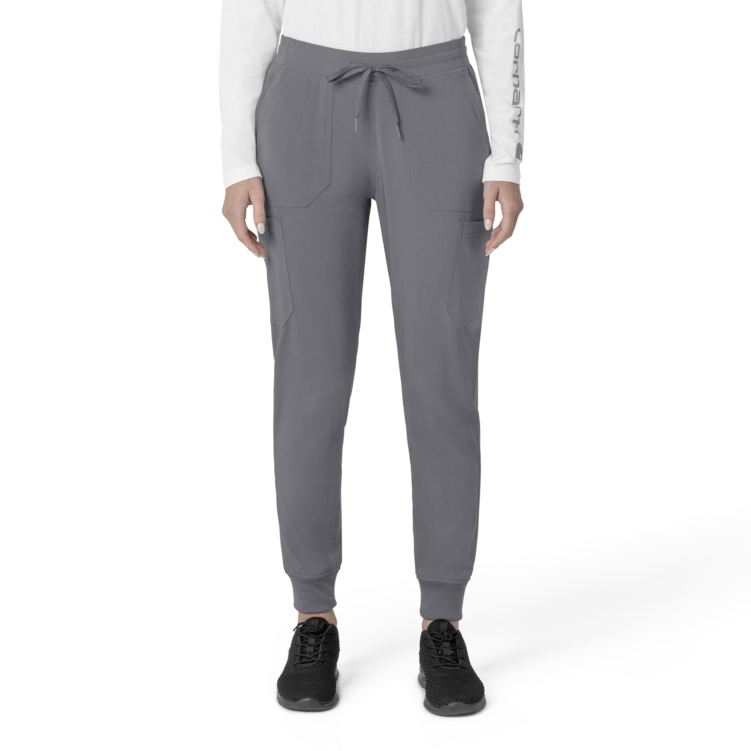 The Carhartt Women's Cargo Jogger Scrub Pant your dependable partner for demanding days in the medical field. Crafted from a durable and comfortable polyester spandex blend, these pants offer the flexibility you need to handle any task with ease. Whether you're pushing carts, adjusting equipment, or attending to patients, the built-in flex ensures you move freely and comfortably. The rib-knit comfort waistband with elastic and a full drawstring ensures a secure, no-pinch fit that won't dig in during long shifts. These jogger-style scrub pants feature a rib-knit cuff at the bottom for a stylish and secure fit. Stay organized with multiple pockets, including deep front slash pockets, cargo pockets with pen and cell phone slots, Carhartt-style back pockets, and a secure zip pocket with a mesh pocket bag. Your essentials are always within reach.With FastDry technology to keep you cool and dry and Rugged Flex stretch technology for unrestricted movement, these scrubs from the Force Cross-Flex collection are designed to help you excel on every shift. Trust Carhartt for the durability and comfort you need in your medical uniform.Specifications