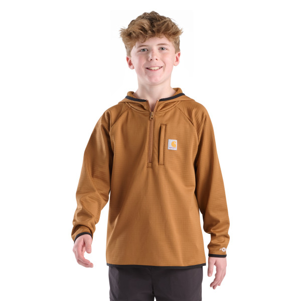 BUILT WITH CARHARTT FORCE TECHNOLOGY TO WICK SWEAT AND DRY FAST; FRONT ZIPPERED LEFT CHEST POCKET; HOODED HALF-ZIP SWEATSHIRT WITH ELASTIC BINDING; SEWN ON WOVEN CARHARTT LABEL