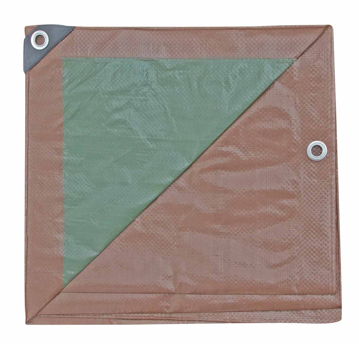 Color: Brown/Green reversible; Full finish size means that the size listed on the packaging is the true size of the finished tarp; Ideal for Farms Home Construction Camping or wherever you need protection from the elements.; No recycled resin or powders used means increased strength and durability; Quality 120 gsm polyethylene tarp 10 x 10 weave laminated both sides and UV treated; Reinforced Corner Bars; Rust proof aluminum grommets approx. every 3 ft.; Welded hem reinforced with PP rope