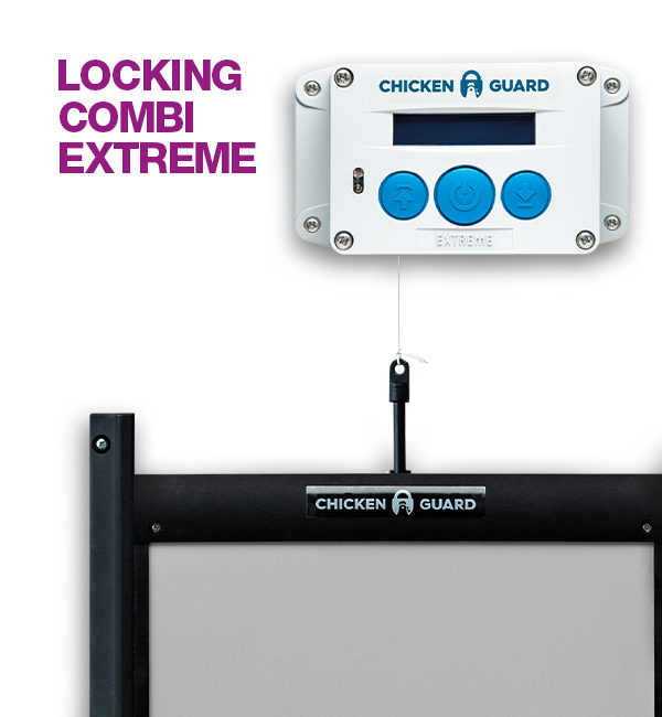 The ChickenGuard Extremeis definitely the beefiest door opener. With the same great features as the Premium, the motor has also been upgraded to an impressive 4kg/8lbs capacity making it ideal for larger, heavier doors and commercial coops, to keep foxes and other predators out of your hen houses. It is just as simple to install as our other units and to program the timer and can also be set to utilize the light (LUX) sensor for an additional opening and closing option. An integrated LCD screen ensures it is easy to set up and alter timings when necessary. And we have even designed extra big buttons so you can program the unit with your gloves on in the winter we really do understand all about bad weather.Specifications