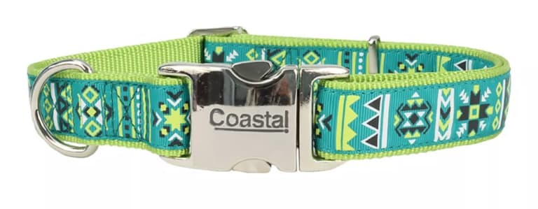 ADJUSTABLE DESIGN PROVIDES SECURE, COMFORTABLE FIT; CONTEMPORARY PATTERNS SCREEN-PRINTED ON RIBBON OVERLAY FOR ADDED STYLE; DURABLE MATERIAL FOR LONG-LASTING USE; METAL BUCKLE; PAIRS WITH MATCHING HARNESS AND LEASH FOR COMPLETE LOOK; SAFE FOR TIE OUT WITH LIGHTWEIGHT ALUMINUM BUCKLES