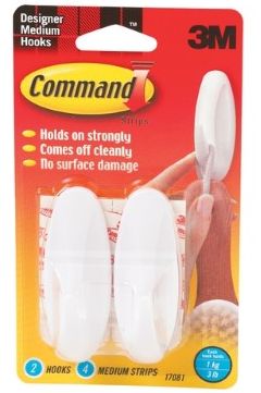 Command Hooks let you hang what you want where you want without the hassle of tools and nails; Command Strips hold strongly on a variety of smooth finished surfaces and these adhesive hooks remove cleanly with no sticky residue or damage left behind; Includes: 2 hooks and 4 medium indoor strips; 1 hook holds 3 lbs; Life is easier when everything has its place; Organize your home damage-free with Command Designer Hooks