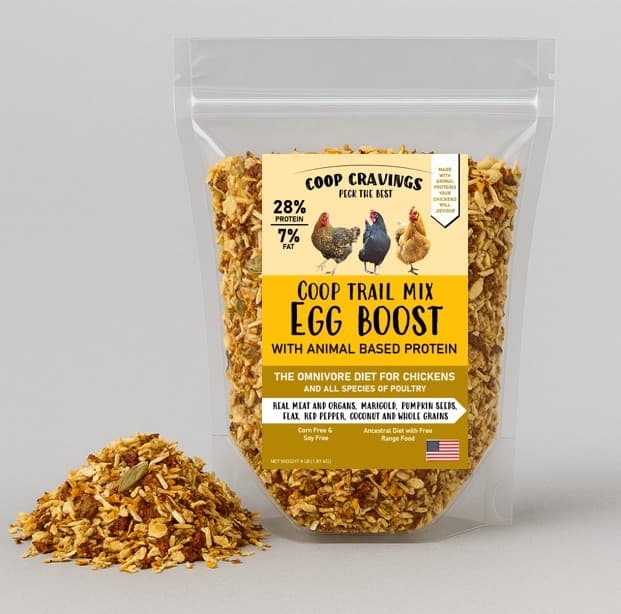 Coop Cravings Coop Trail Mix Egg Boost Treat is a functional, high-value layer treat formulated to improve yolk pigmentation, shell quality, and overall production. Designed around the omnivorous biology of chickens, it combines energy-rich grains (wheat, barley, oatmeal) with animal proteins (beef, pork, organ meats, ground bone) to deliver a complete amino acid profile. Natural carotenoids from marigold and red pepper enhance yolk color, while fatty acid sources from pumpkin seed, sunflower, coconut, and flax support feather condition and immune health.Suitable for year-round use as a top-dress, ration enhancer, or treat mix. Clean label. No synthetic colors, no soy, no artificial additives.Specifications