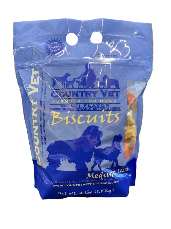 Multi Flavor Country Vet biscuits for small to medium dogs. Each biscuit is individually flavored as original, cheese, barbeque or peanut butter. The smorgasboard of flavors will keep your best friend coming back for more. Made in USA.Specifications