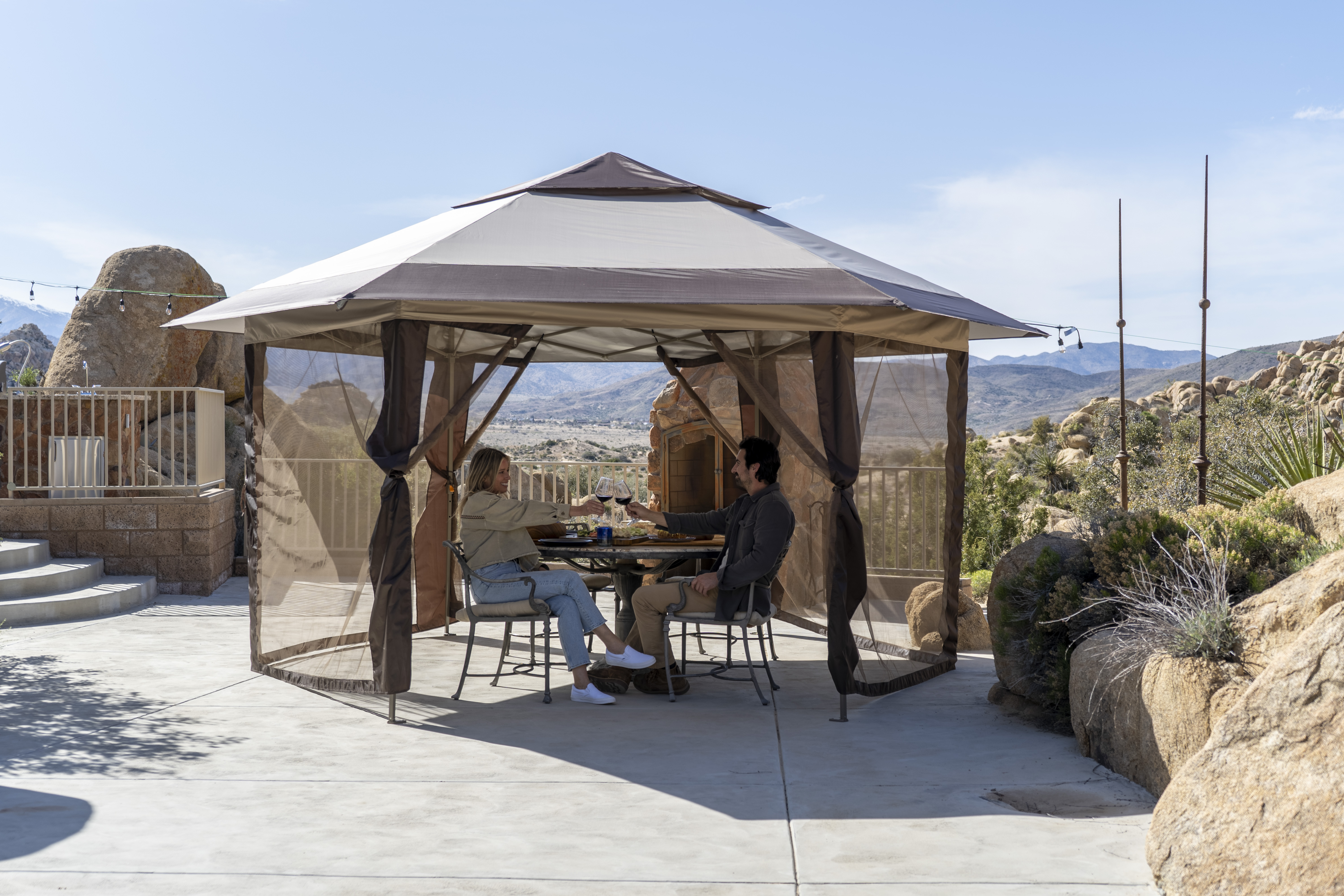150 Denier Top With Silver Coating For UV Proteciton; 170 Sq Feet Of Shade; 6 Sided Hexagonal Screen Room; 600 Denier STO-N-GO Cover; One Push Center-Lok Canopy; Polymer Leg Feet; Push Button Easy Height Adjustment; Reinforced Steel Frame; Vented Top; Wheels On Frame