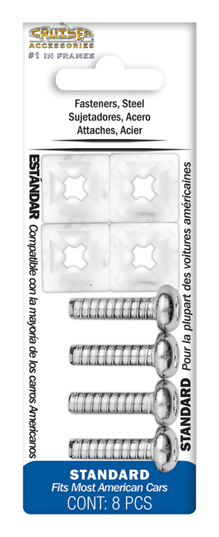 Designed to fit all novelty/license plates for domestic vehicles; Includes four 4 1/4 x 3/4 inch 6.35 mm x 19.5 mm fasteners and four 4 plastic nut grommets; Standard steel fasteners are made of zinc plated steel for mounting a novelty/license plate to a vehicle