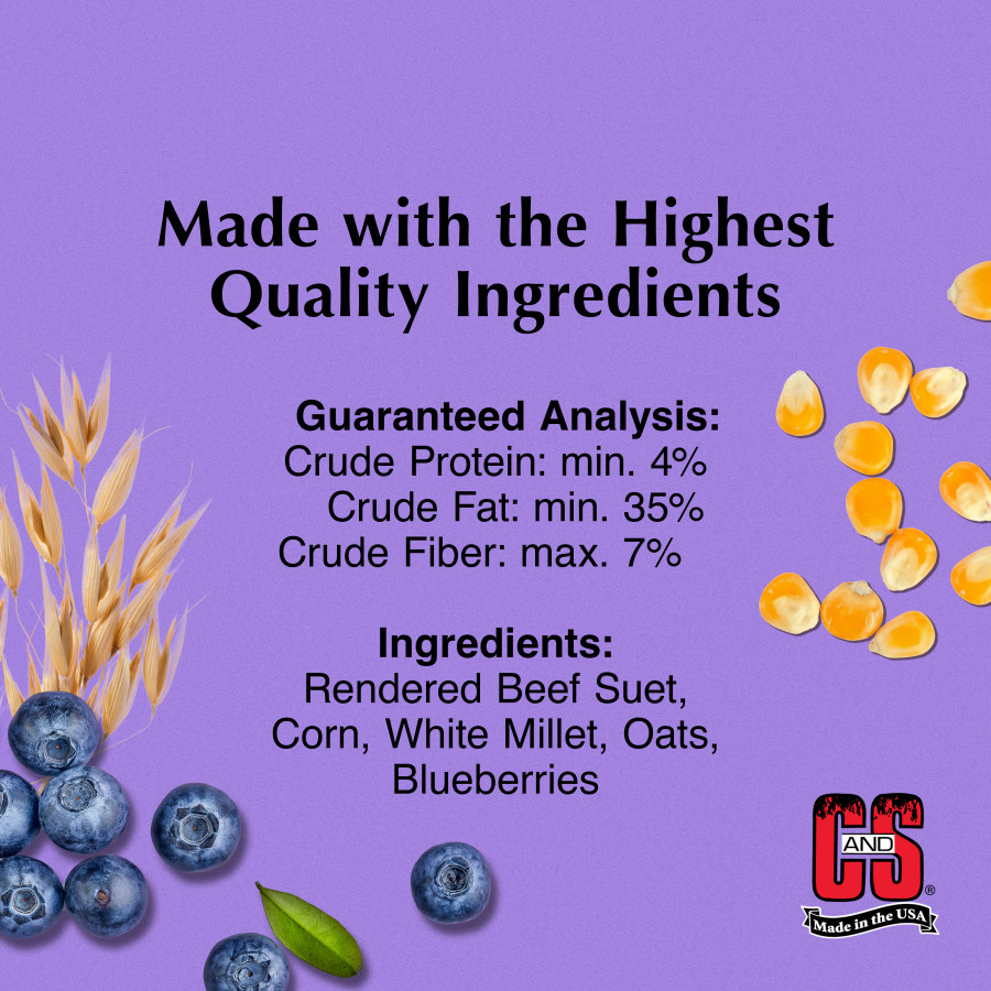 At C&S Products, we know wild bird feeding can bring so much joy. That’s why our suets are made with only the best ingredients and nutrients, so you can attract a wider range of birds to your backyard. C&S Berry Suet is perfect for year-round feeding and features a unique formula that attracts fruit-eating birds. This high-energy fat base is ideal for cake feeders and is a quick and easy source of energy for the birds in your yard. Our suet is highly nutritious to provide wild birds with much needed energy when they need it. Refrigerate for easy removal. Remove wrap and insert into suet feeder. C&S Products Company is the leader in the Wild Bird Suet Market. Since our founding in 1986, C&S Wild Bird Feeding products and accessories have achieved unprecedented levels of customer satisfaction and loyalty. We take pride in our reputation of creating the highest quality products! We are committed to offering our customers products that give great value and bird loving results!Specifications