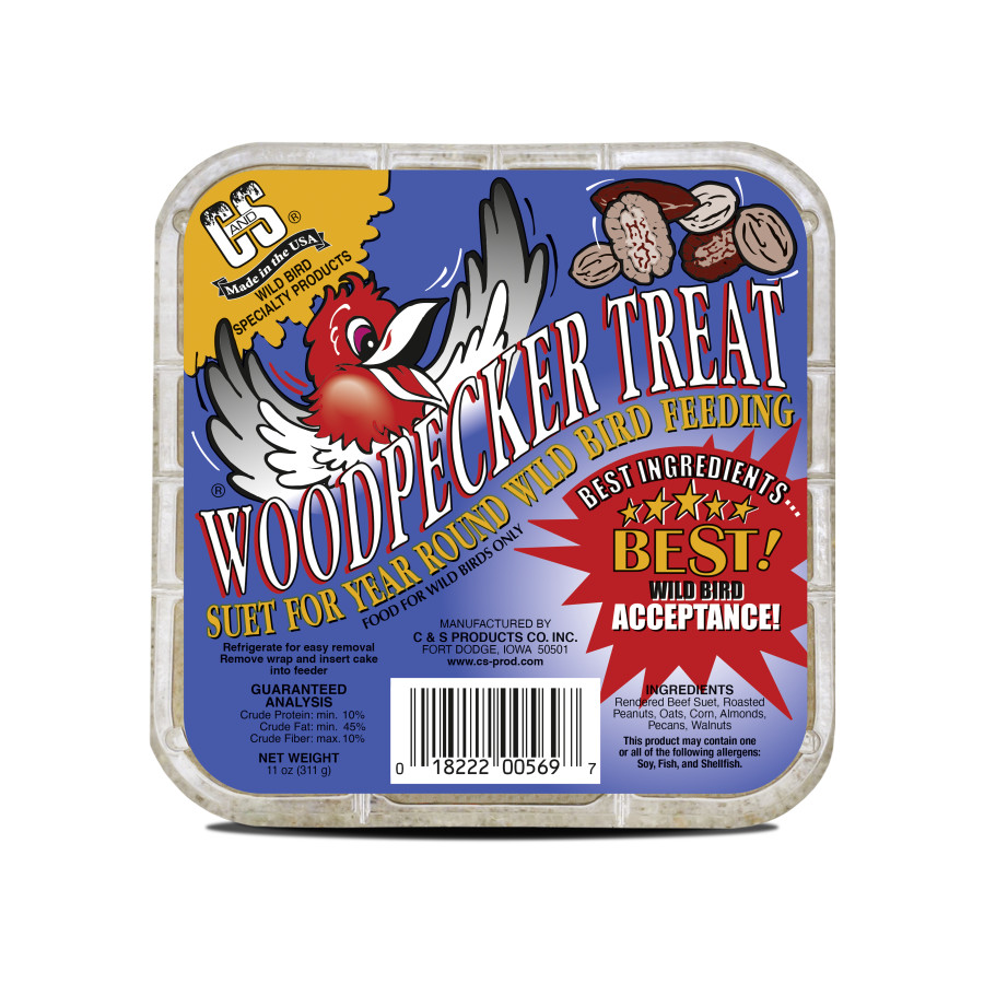 At C&S Products, we know wild bird feeding can bring so much joy. That’s why our suets are made with only the best ingredients and nutrients, so you can attract a wider range of birds to your backyard. C&S Woodpecker Suet is perfect for year-round feeding, mimics natural feeding habits and caters to dietary preferences. This product provides a boost in protein, is rich in healthy fats, ideal for cake feeders and a quick and easy source of energy for the birds in your yard. Our suet is highly nutritious to provide wild birds with much needed energy when they need it. Refrigerate for easy removal. Remove wrap and insert into suet feeder. C&S Products Company is the leader in the Wild Bird Suet Market. Since our founding in 1986, C&S Wild Bird Feeding products and accessories have achieved unprecedented levels of customer satisfaction and loyalty. We take pride in our reputation of creating the highest quality products! We are committed to offering our customers products that give great value and bird loving results!Specifications