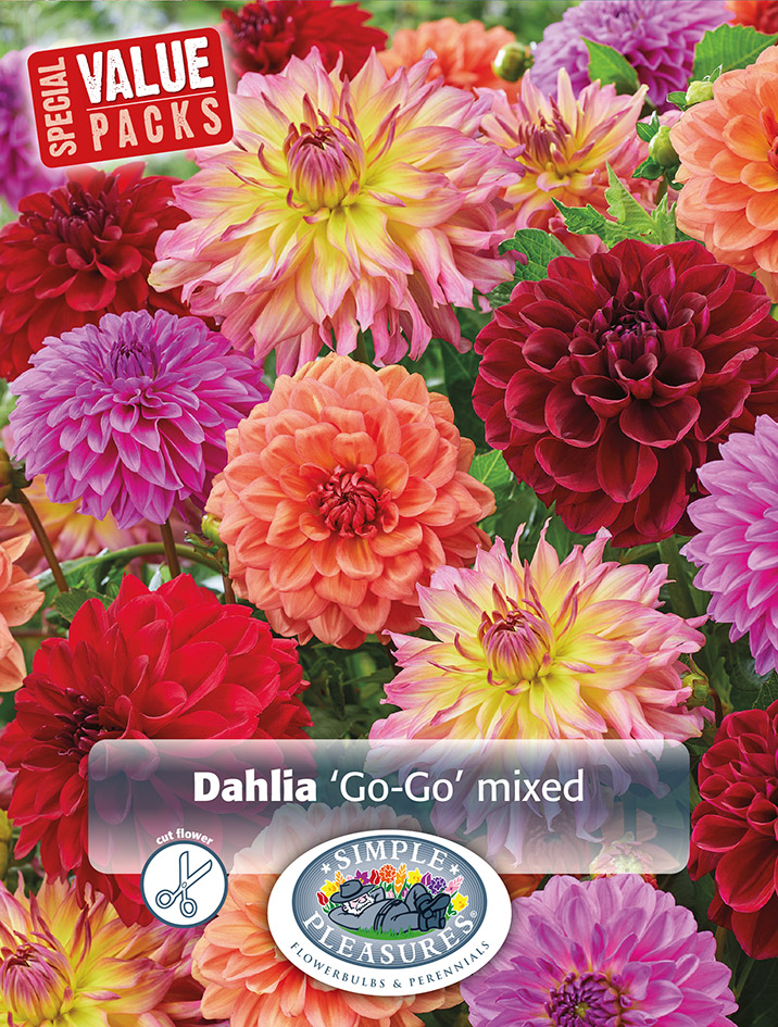 This colorful blend Go-Go Dahlias produce 5" blooms. Does well in sun and partial shade locations. Excellent for borders, edgings, patios and containers.Specifications
