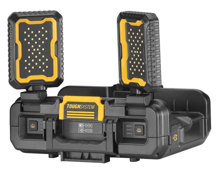 360° light coverage; Adjustable dual pivoting LED heads; Compatible with all Toughsystem 2.0 components.; Durable folding handle with integrated storage; Powered by 20V MAX battery; Up to 3 hours of runtime