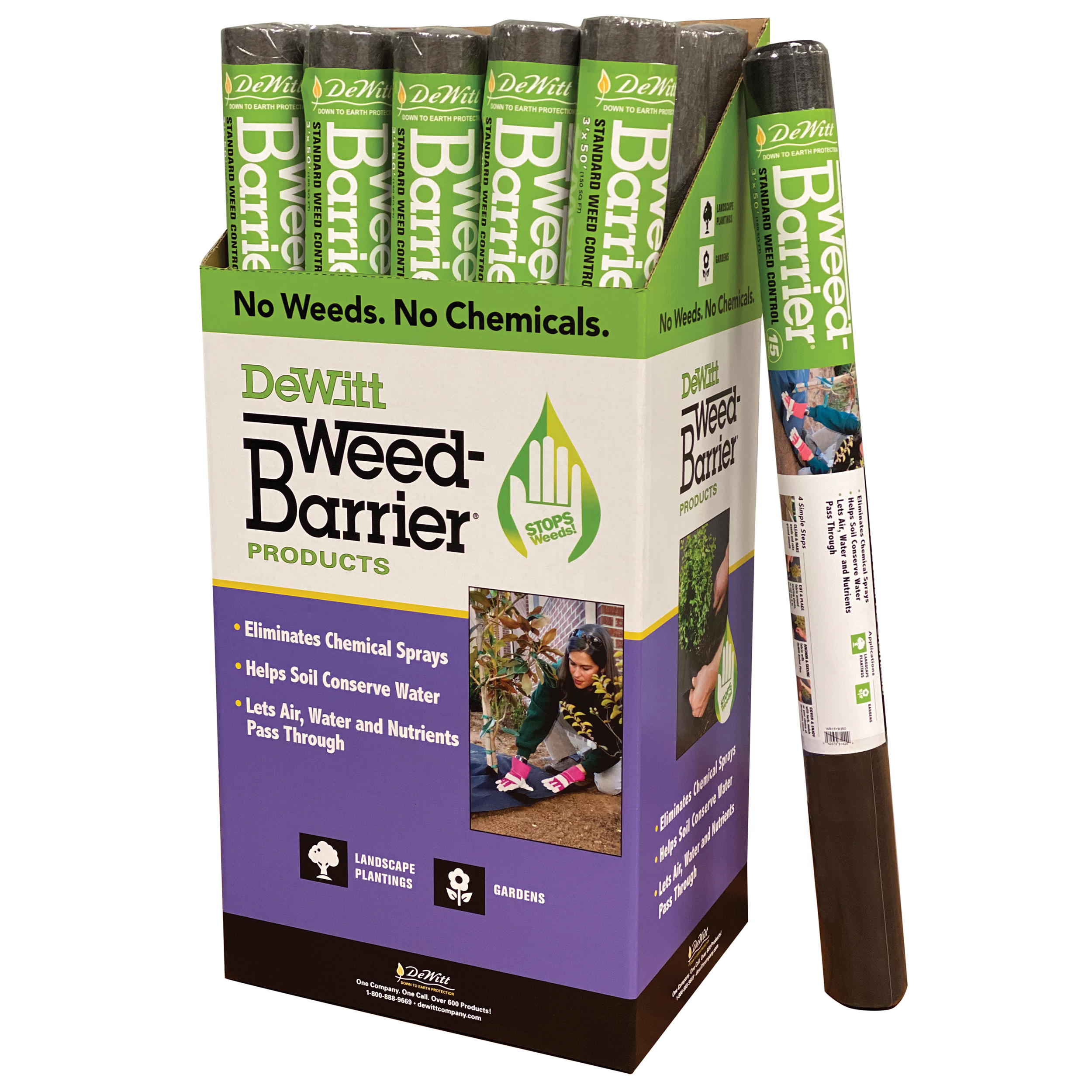 DeWitt Weed-Barrier 3ft x 50ft DeWitt Weed-Barrier - Std. Weed Control - 15 Year - 3ft x 50ft - is ideal for permanent landscape areas, flower beds, shrubs and trees to control weeds. Allows water, air and nutrients to pass freely to soil while blocking sunlight. Will last for years in direct sunlight, but more appealing under 2in to 3in of bark mulch. Made of ultra violet-treated Pointbond Polypropylene 15 year product is 1.5 oz. per square yard.Specifications