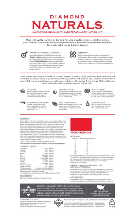 Lamb protein and moderate levels of fat help support a healthy body condition while providing the nutrients your dog needs to stay active day after day. Guaranteed levels of zinc, selenium and vitamin E ensure that your dog receives proper antioxidant nutrition, while omega-6 and omega-3 fatty acids from superfoods help maintain healthy skin and a shiny coat.Specifications