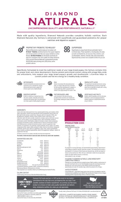 Start your brand new big puppy off right with superior nutrition from Diamond Naturals Large Breed Puppy Formula Dry Dog Food! Each Diamond Naturals dry formula is enhanced with superfoods and guaranteed probiotics to support your growing hound’s development and overall health. This dry puppy food recipe is made with real lamb as the first ingredient followed by real fruits and vegetables including peas, garbanzo beans, papaya and coconut! It provides your puppy with protein and minerals, along with omega fatty acids to help promote healthy skin and a shiny coat, plus antioxidants for overall nose-to-tail well-being. Help your pal achieve a complete and balanced holistic diet with Diamond!Specifications