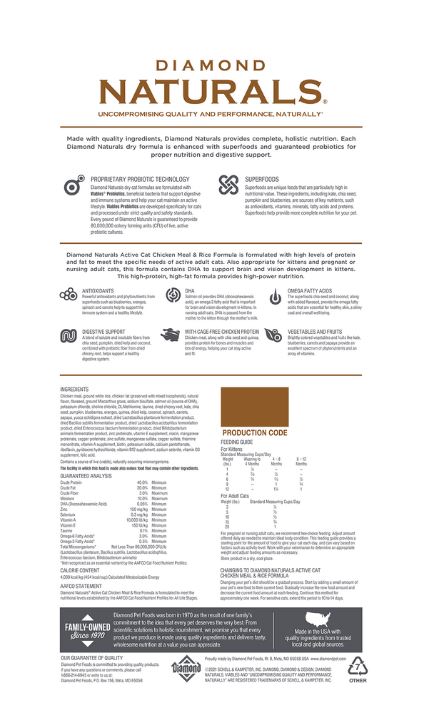 Diamond Naturals Active Cat Chicken Meal & Rice Formula is formulated with high levels of protein and fat to meet the specific needs of active adult cats. Also appropriate for kittens and pregnant or nursing adult cats, this formula contains DHA to support brain and vision development in kittens. This high-protein, high-fat formula provides high-power nutrition.Specifications