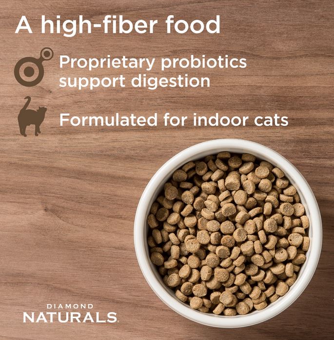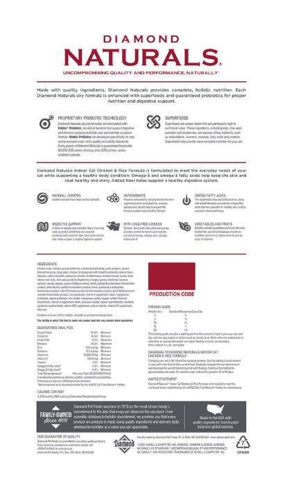 Diamond Naturals Indoor Cat is specifically formulated to meet the everyday needs of your cat while promoting an ideal body condition. Omega-6 and omega-3 fatty acids help keep the skin and coat healthy and shiny. Added fiber helps support a healthy digestive system.Specifications