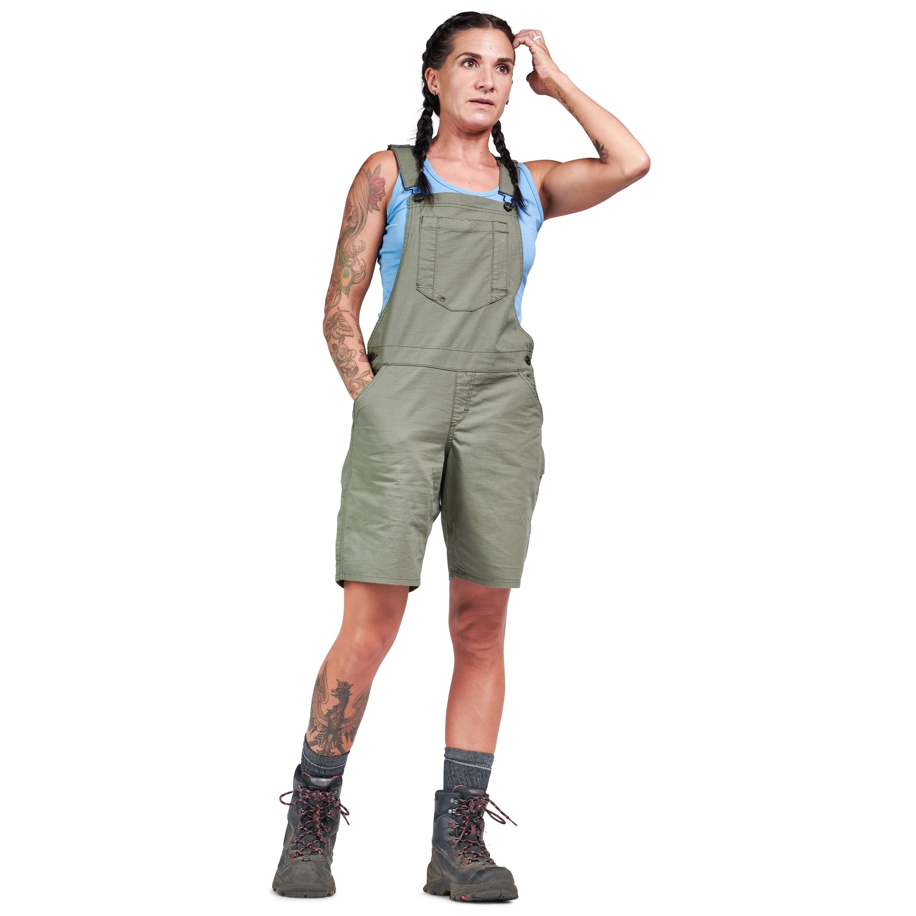 The Dovetail Workwear Freshley Shortall is serious workwear that's undeniably cool. The little sister of Freshley Overalls in lichen green ripstop, Dovetail shortalls are fun-sized and functional. Made from ultra-light ripstop, this shortie offers everything you want: a whopping 12 pockets, breathability for hot days, water/stain resistance, and UPF 50+ protection. The convenient Twine Hole lets you run a spool out of your bib front pocket, leaving your hands free to tie up green zebra tomatoes, take up knitting, or even learn how to rewire that broken lamp.Specifications