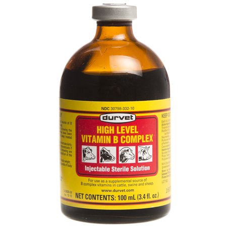 Durvet 100 mL High Level Vitamin B Complex is for use as a supplemental source of B Complex vitamins in cattle, swine and sheep.Specifications