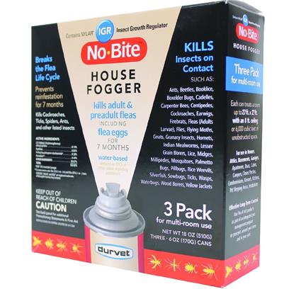 No-Bite IGR House Fogger contains a combination of NYLAR insect growth regulator Pyrethrum and Permethrin to break the flea life cycle and kill adult & preadult fleas including flea eggs to prevent reinfestation for 7 months.Specifications