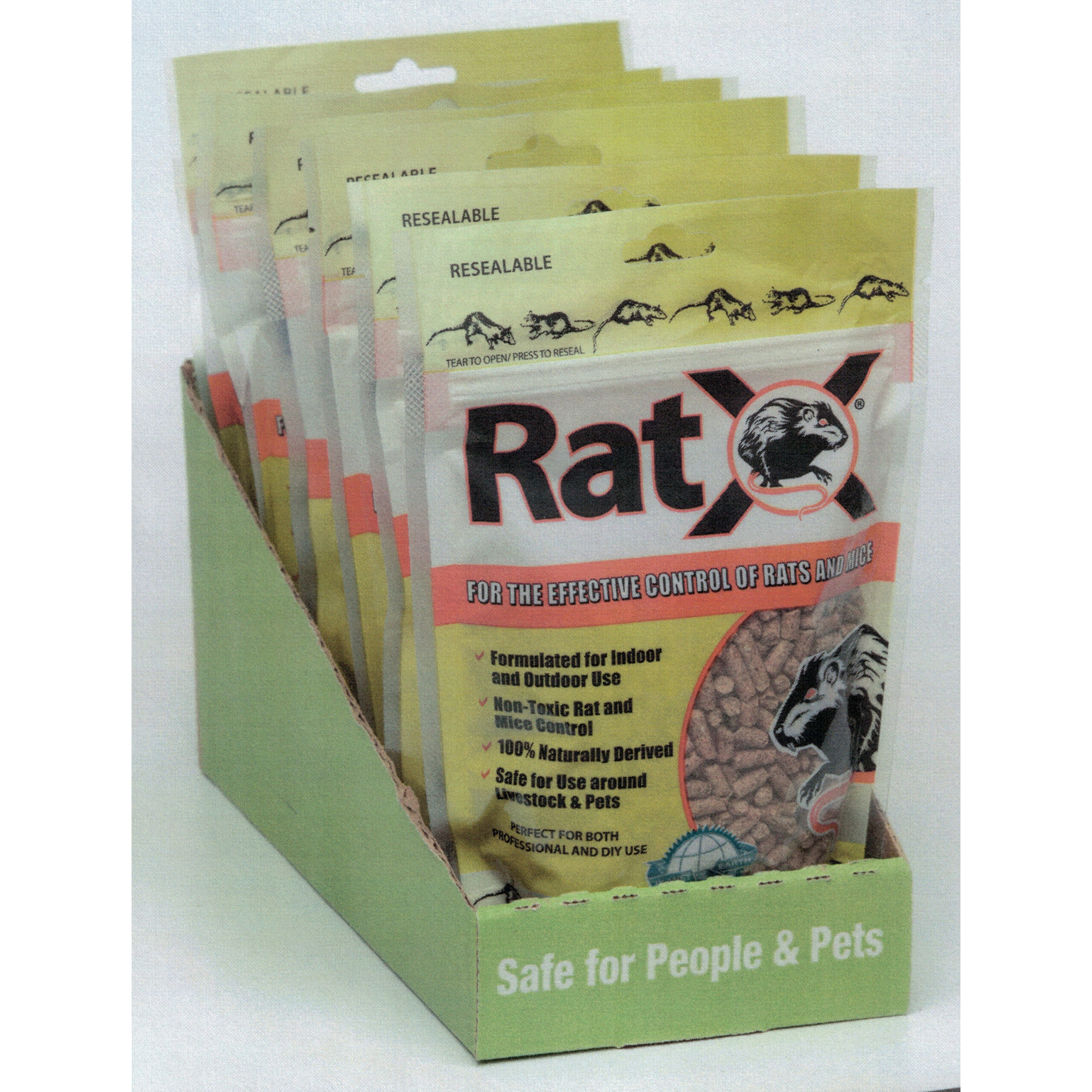 When used as directed, RatX Pellets are effective for indoor and outdoor rat and mouse control. Safe for use around cats, dogs, and children. Place these easy-to-use pellets around landscaping, near livestock or poultry housing, or under buildings or garden structures. Formulated using naturally derived ingredients, RatX Pellets attract rats and mice with their scent and taste when used as directed. Once ingested, active ingredients in the pellets coat the rat or mouse’s stomach lining, blocking all messages from the stomach to the brain. This causes rats and mice to stop wanting water, leading to eventual dehydration and death.Specifications