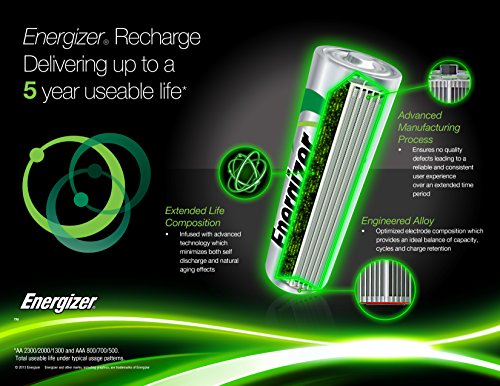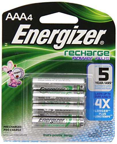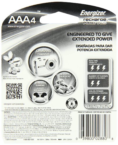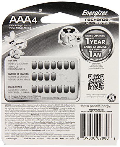 Keep your family fully powered every day with our best performing long-lasting Energizer Recharge Power Plus batteries. Pre-charged and ready to go when they arrive on your doorstep these rechargeable batteries help you save money and create less waste over time reducing environmental impact. Each Energizer Recharge Power Plus AAA battery can be charged and used up to 700 times. Dont feel like using your charged-up batteries right away? The charge lasts up to one year in storage. Simply pair up with any Energizer Recharge Charger to power up your most essential devices like digital cameras handheld GPS and wireless gaming systems and keep the power going.Specifications