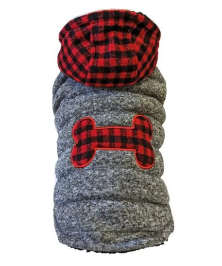 YOUR PET IS GOING TO THANK YOU WHEN WEARING THIS SNUGGLY AND WARM COAT ON THOSE COLD WINTER DAYS. SOLID GRAY WITH RED BUFFALO PLAID HOOD AND BONE SHAPE APPLIQUE. REVERSES TO SOLID BLACK SHERPA. HOOD IS FULLY LINED LEASH HOLESpecifications