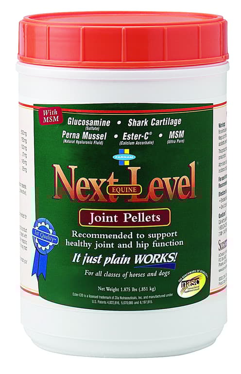 1.875 POUNDS; ALL THE POWER OF NEXT LEVEL JOINT FLUID IN PALATABLE ALFALFA-FLAVORED PELLETS; CONTAINS GLUCOSAMINE CHONDROITIN PERNA MUSSEL ESTER-C AND MSM TO KEEP JOINTS LUBRICATED; CONVENIENCE OF PELLETS WONT FREEZE IN COLD TEMPERATURES; GREAT FOR HORSES AND DOGS