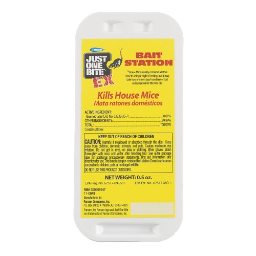 Effective indoor house mouse control with stop feed action. Each disposable bait station is pre-loaded with a 0.5 oz. Block of just one bite EX Mouse bait. Moisture-resistant Mouse bait contains bromethalin, an extremely toxic nerve poison. Due to stop feed action, house mice, Norway rats, & roof rats cease feeding after consuming a toxic dose. Effective against anticoagulant resistant house mice. Epa (environmental protection Agency) compliant.Specifications