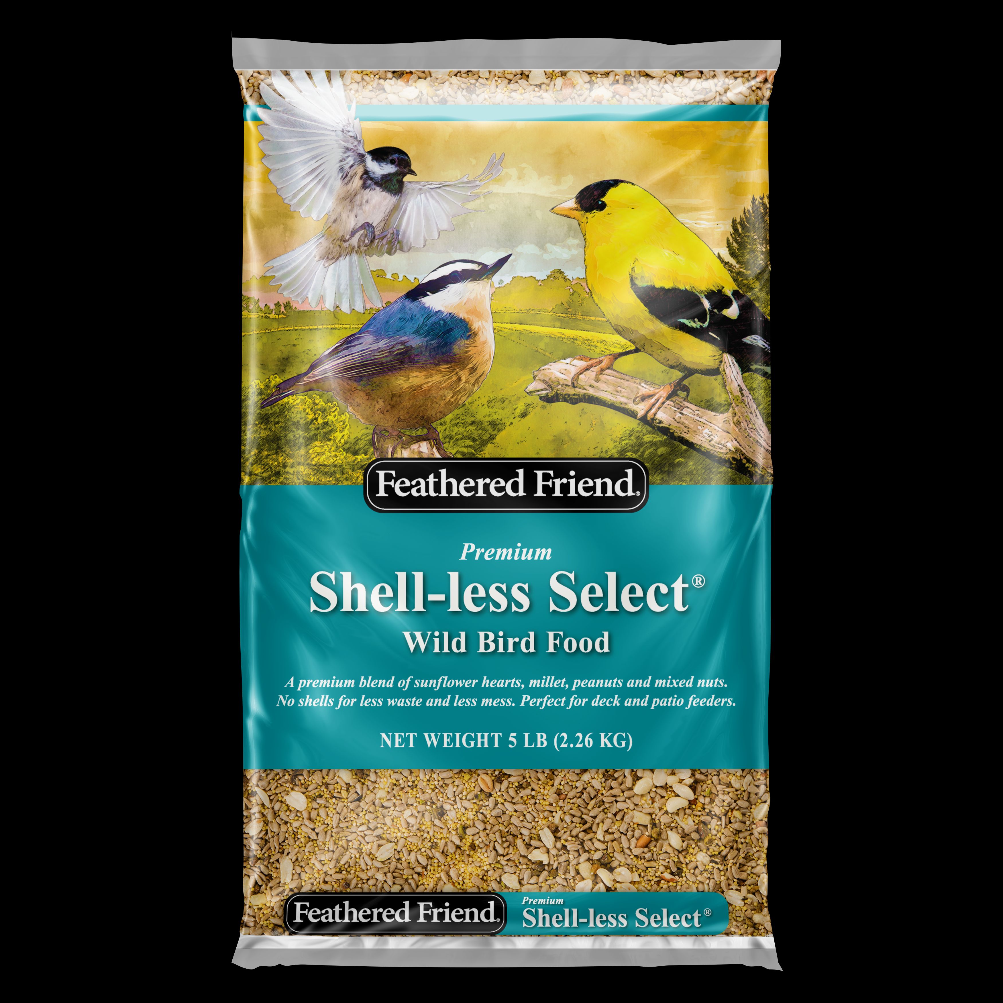 Feathered Friend Shell-less Select Wild Bird Food is a fully edible blend of premium bird food ingredients including hulled sunflower and millet with delicious peanuts and pistachios. Your backyard birds can enjoy a ready-to-eat meal and you can enjoy less mess under your feeder.Specifications
