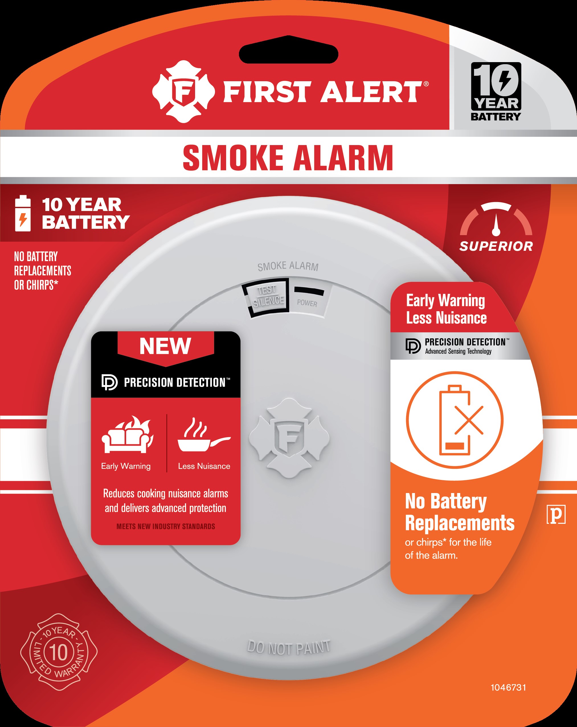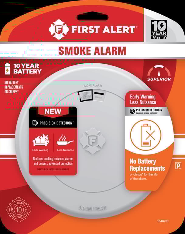 10-year sealed battery eliminates battery replacements and low battery chirps for the life of the alarm; Complies with new industry standards to reduce cooking nuisance alarms and provides early warning in the event of a home fire emergency; End-of-life warning lets you know when it’s time to replace; Test/silence button for efficient testing to ensure the detector is working properly