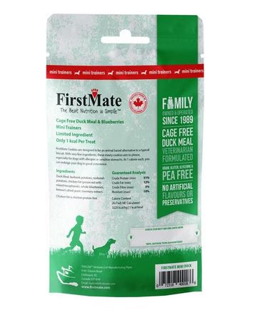 For a meat-based alternative to regular dog biscuits, try FirstMate Cage Free Duck Meal & Blueberries Grain-Free Dog Treats! These simple-yet-scrumptious dog treats are made with cage-free duck meal and yummy blueberries. They contain no grains, glycerine, gluten or peas. Plus, they’re paw-fect for use during training sessions or as a just-because snack.Specifications