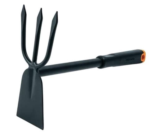 Cultivator Hoe Tool by Fiskars. Two essential garden tools have been combined into one, allowing you to loosen soil, uproot plants, and dig with a simple flip of the handle. This durable cultivator hoe features a sharpened hoe blade for breaking up hardened clods of soil and pointed cultivator tines for loosening soil. In addition, a lightweight, teardrop-shaped handle helps reduce fatigue and includes a hang hole for convenient storage.Specifications