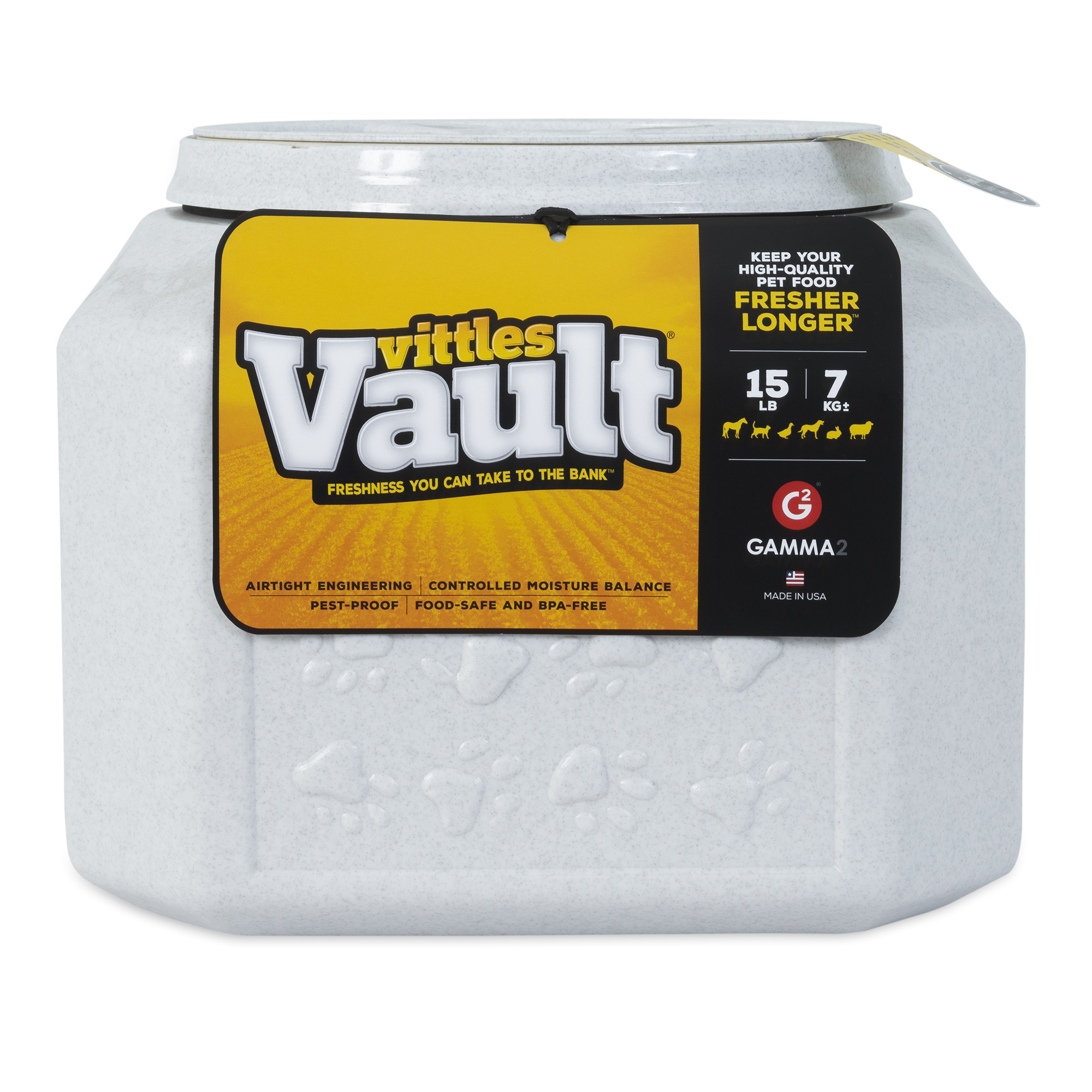 Did you know that storing your pet's food in the bag causes pet food to go stale and lose its crunch and flavor? Your pet may eat food from the bottom of the bag at a slower pace or may just refuse to eat it at all. Keep your pet's food fresh and tasty with Vittles Vault Pawprint Outback Food Storage Container. With a spin of the lid; the Vittles Vault Pawprint Outback Containers keeps food fresh with its patented Gamma Seal Technology which provides an airtight seal that consistently locks in freshness and flavor and keeps pests and harmful moisture out. Engineered with strength and durability in mind; the Vittles Vault Pawprint Outback is made of heavy-duty; food-safe BPA-free plastic that won't shatter or crack if dropped; and can be stored in the barn; garage; backyard; or your pantry. Molded-in handles on all sides make it easy to carry or move. For added convenience; a free pet food scoop is included to make feeding time a breeze.PRODUCT NOTE: Capacity guidelines are based on the shape and density of kibble and feed. When in doubt; round up to the next size.CARE INSTRUCTIONS: We recommend thoroughly washing and drying your Vittles Vault Container regularly. Over time; oils absorb into the plastic; which can cause food to become rancid.Specifications